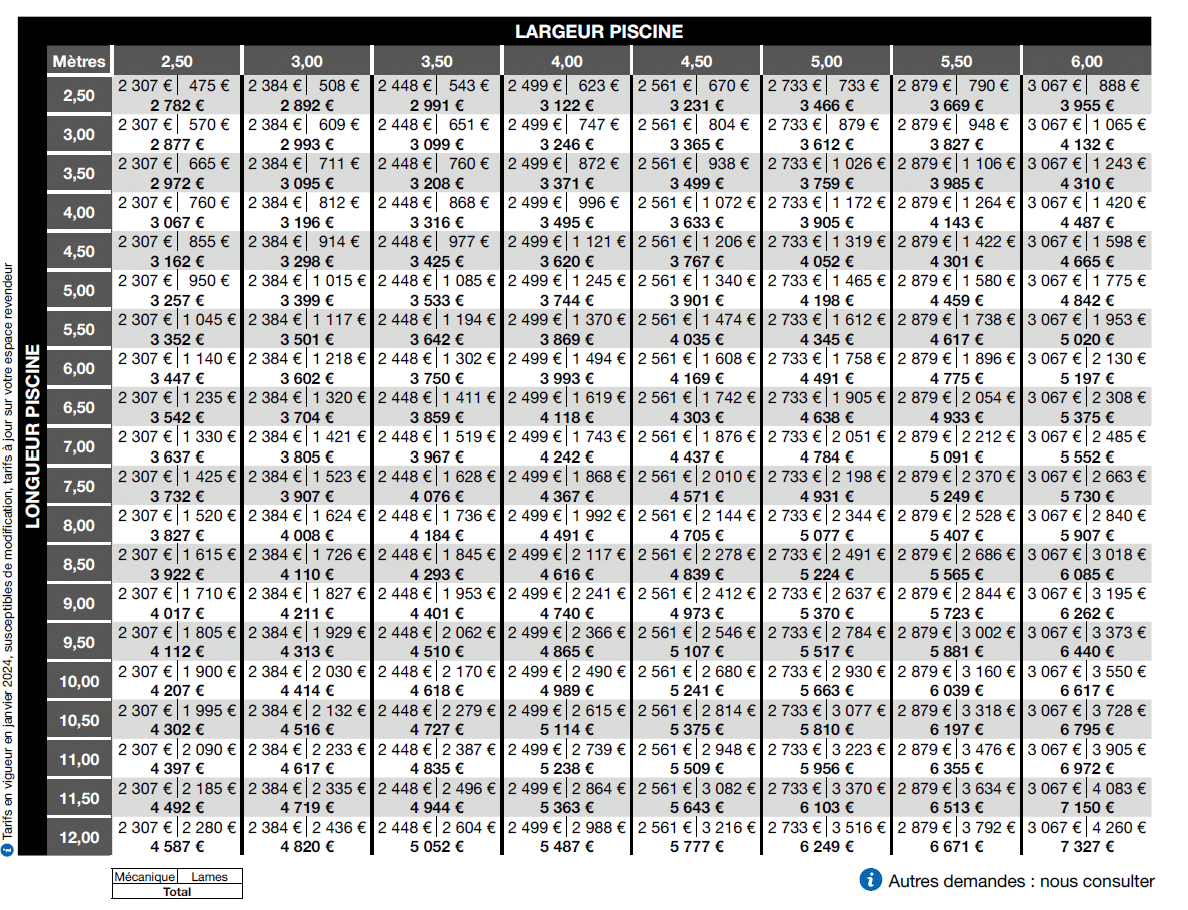 dimensions volet : 2.5 à 6 m de largeur et 2.5 à 12m de longueur (pas de 50cm)